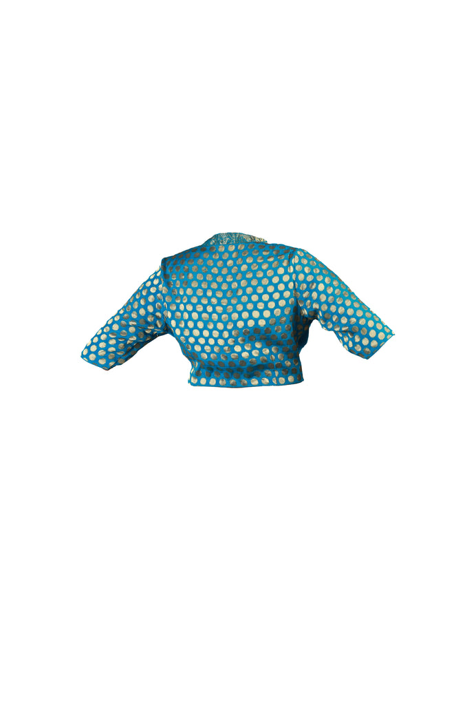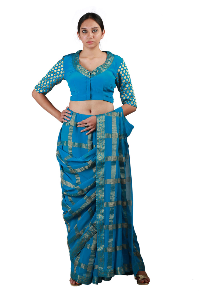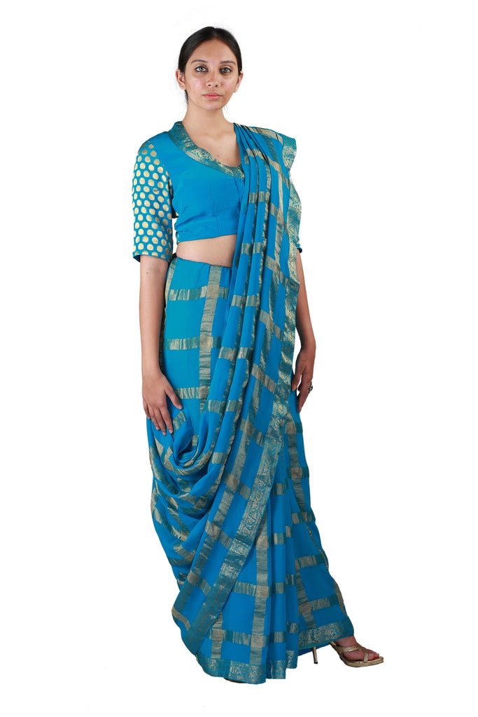 Make heads turn this festive season! Don this gorgeous georgette saree in blue, adorned with broad woven gold checks and woven border and paired with a blue crepe blouse embellished with gold polka on the sleeves.