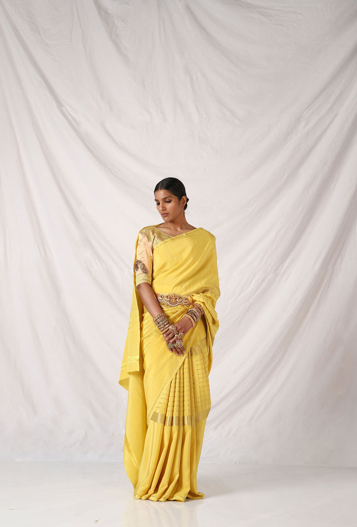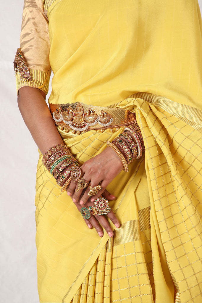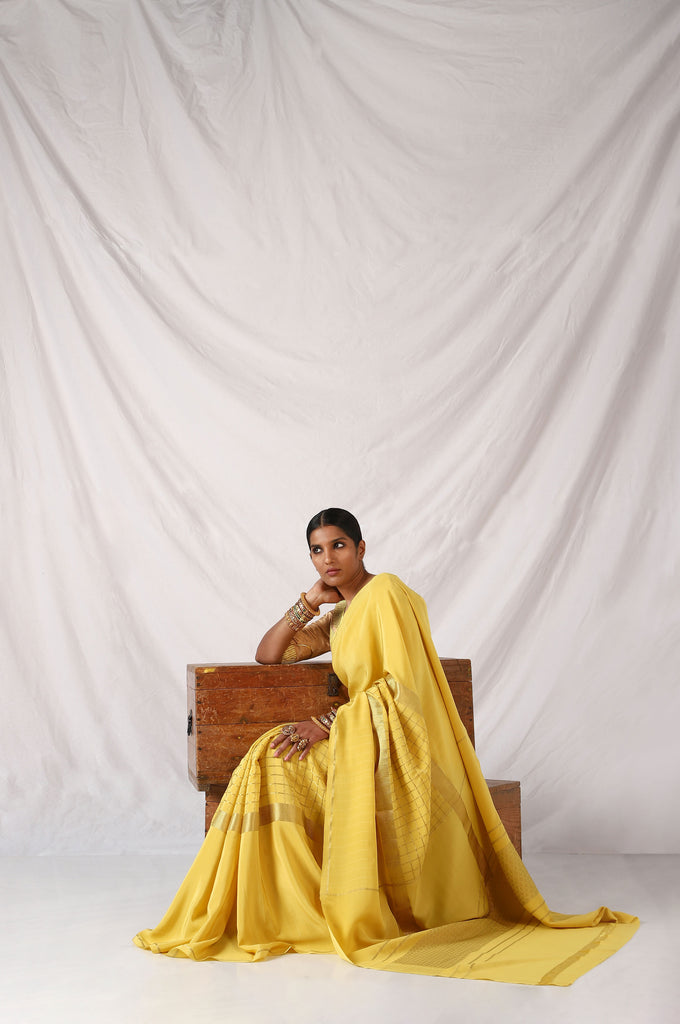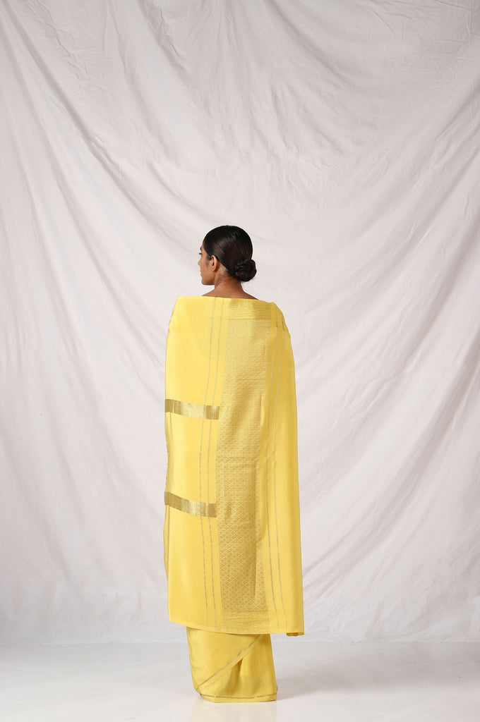 Radiant Eshwari saree in a captivating 'Celery Yellow' or 'ಸೂರ್ಯ ಕಾಂತಿ' tone, skillfully fashioned using interwoven threads of pure gold zari and fantastic Mysore crepe silk.