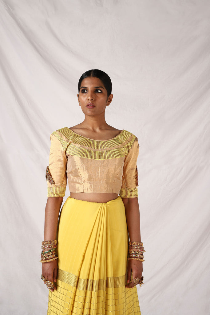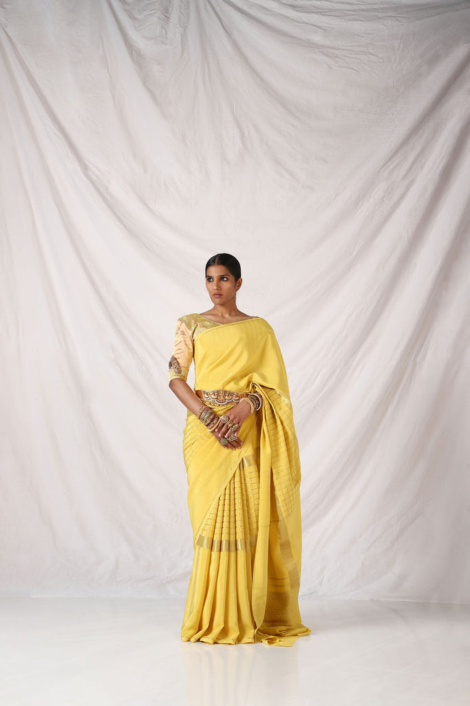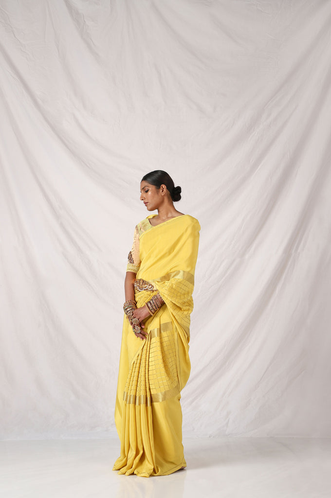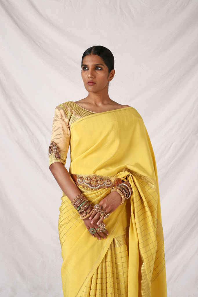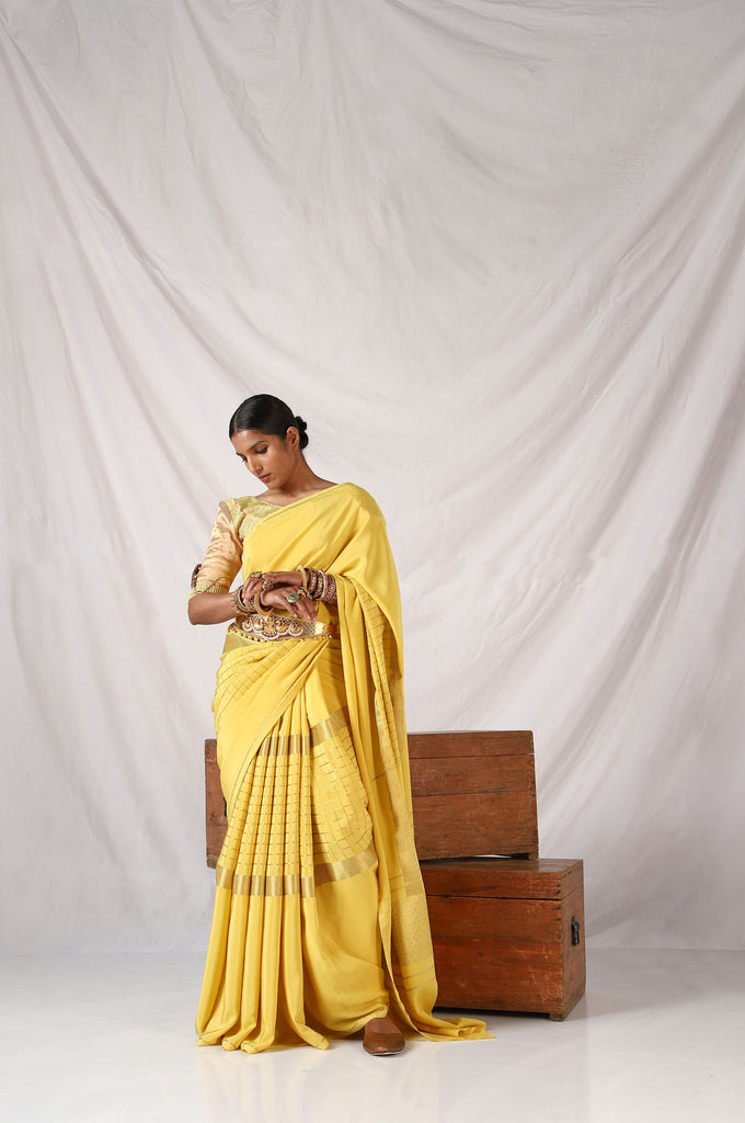 Radiant Eshwari saree in a captivating 'Celery Yellow' or 'ಸೂರ್ಯ ಕಾಂತಿ' tone, skillfully fashioned using interwoven threads of pure gold zari and fantastic Mysore crepe silk.