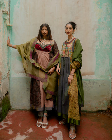 A grey kurta with block-printed panels, paired with warm tones contrast. The embroidered neckline and rustic accessories celebrate timeless handcraft.