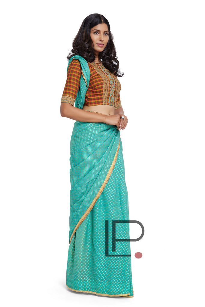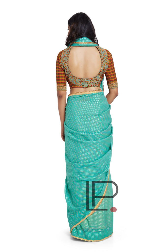 Latha Puttanna depicts her love for perfect blends through this remarkable creation. A turquoise blue chiffon saree studded with gold kadi polkas, is coupled with an earthy hand-embroidered Chettinad blouse, to create the perfect balance between tradition and modernity.