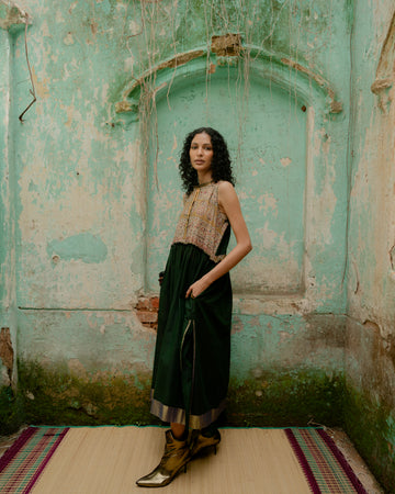 A beige brocade sleeveless bodice with gold and red paisley motifs with deep green flared skirt finished with a gold zari border