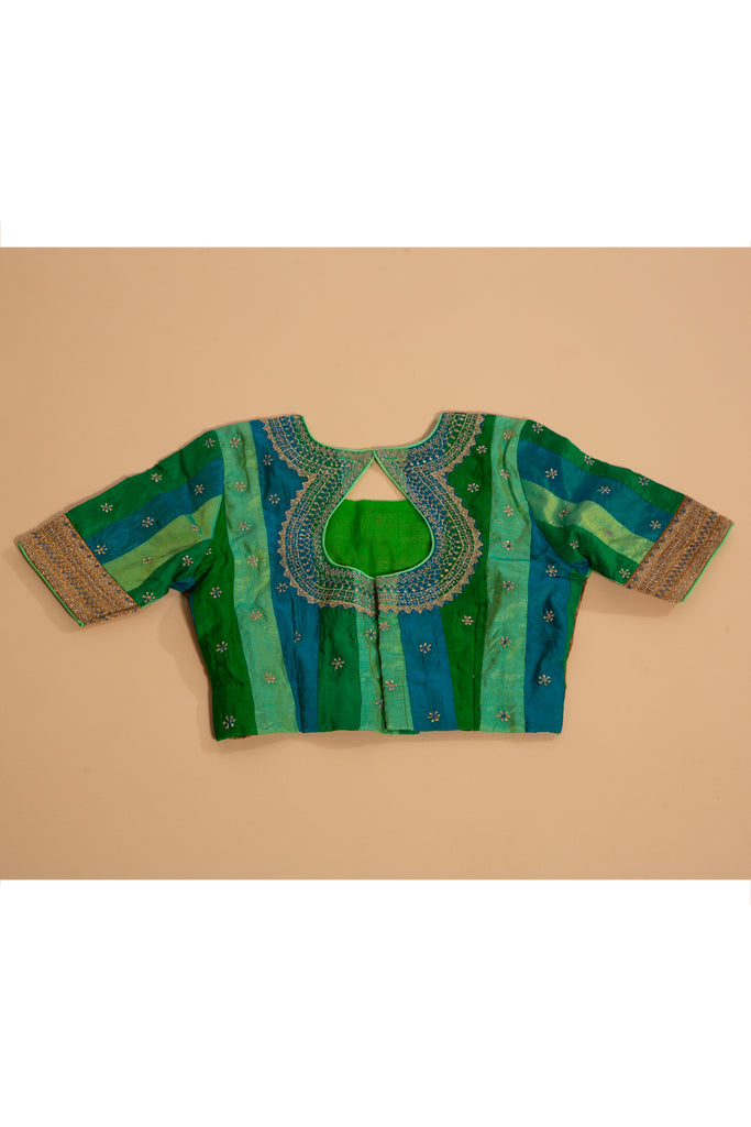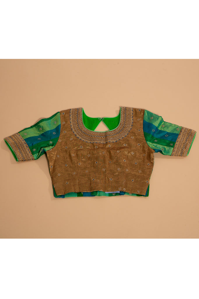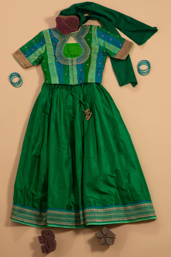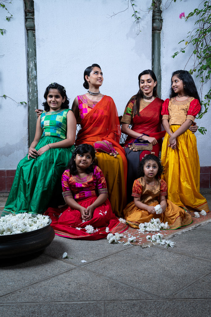 Make this festive season even more special by getting a matching wardrobe for your little one. Don her in this beautiful set comprising a silk patchwork blouse and silk langa, both embellished with intricate gold embroidery that matches your Latha Puttanna classic...!