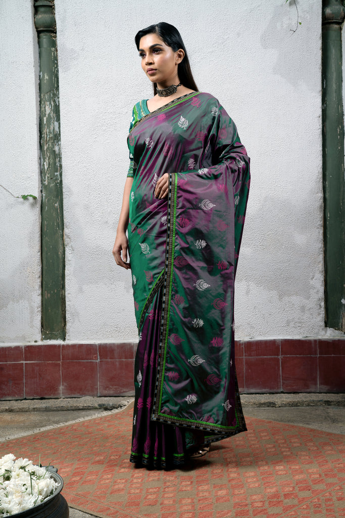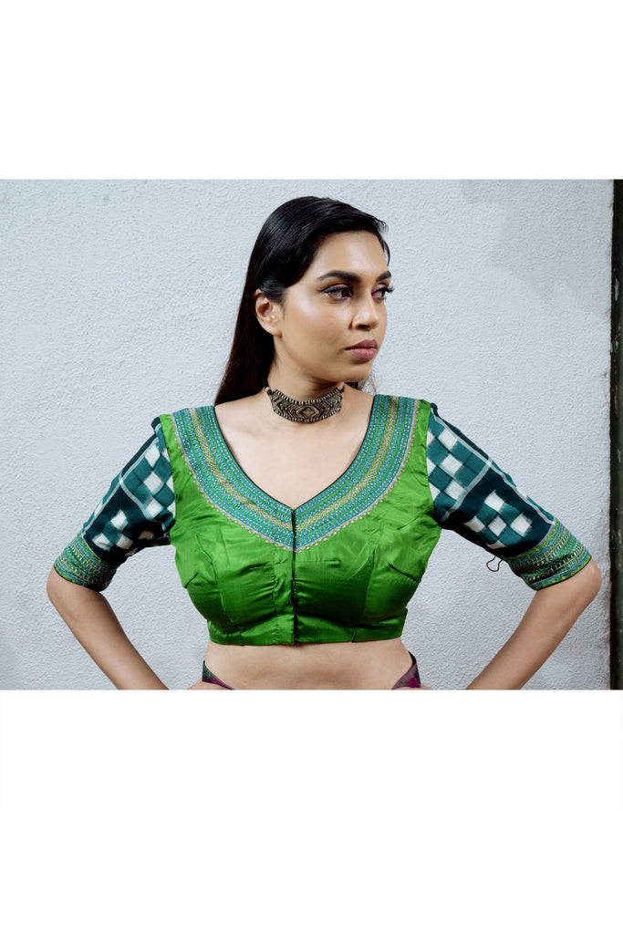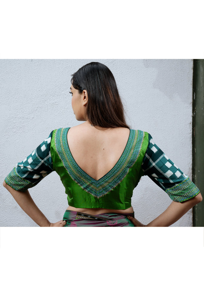 Welcome the winter by looking chic in two-toned silk ! Don this gorgeous green silk saree enhanced with gold hand-block motifs, and paired with an Odisha Ikat blouse with intricate gold zari and thread embroidery.