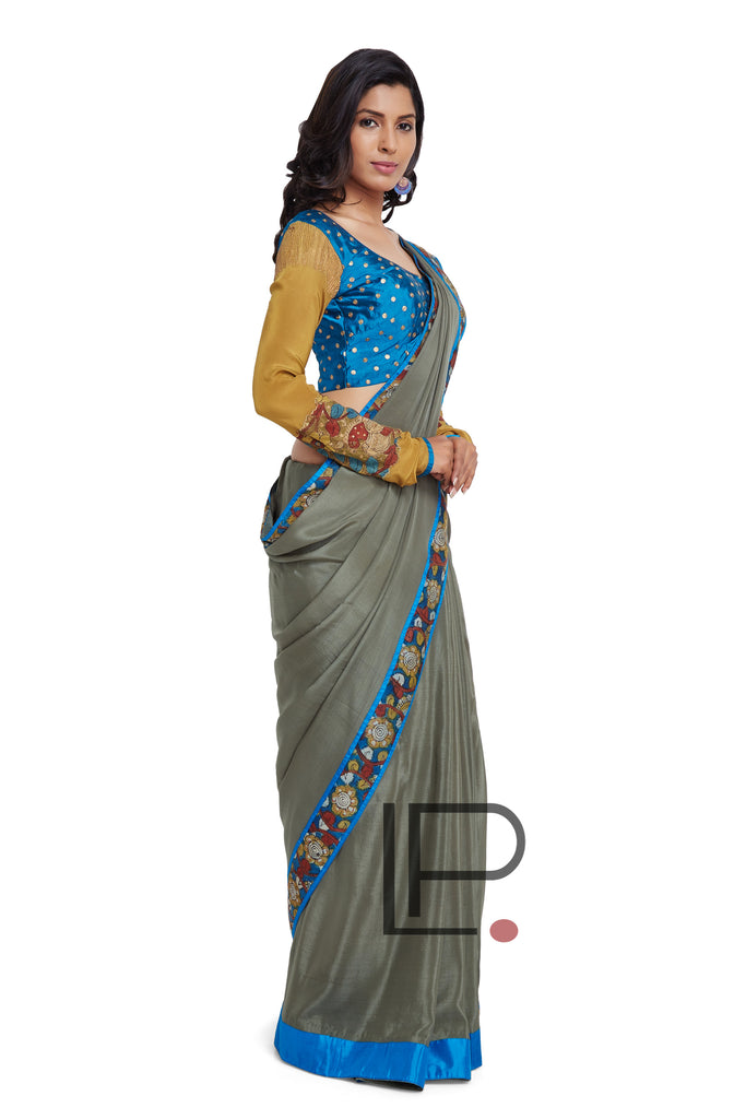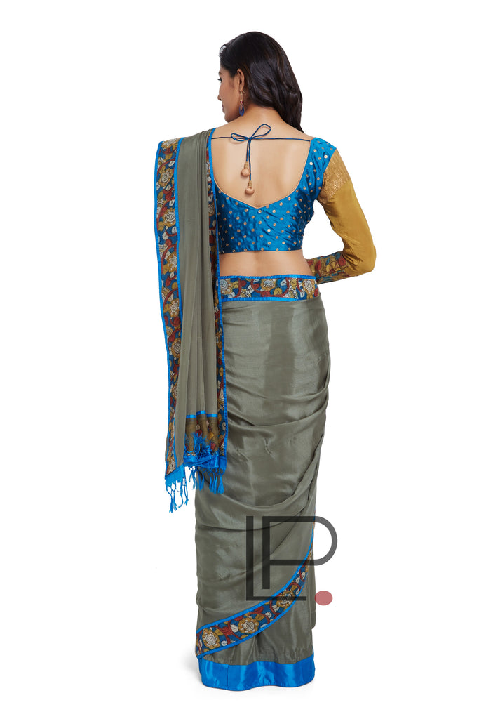 This grey Crepe Silk saree with a traditional Kalamkari border makes for a fluid drape. This saree comes with a stunning blouse that has a blue & gold polka dot printed body and mustard silk chudi full sleeves.