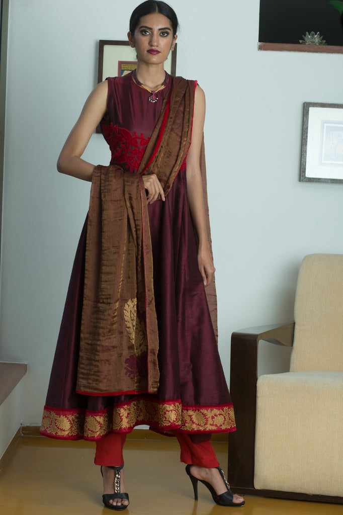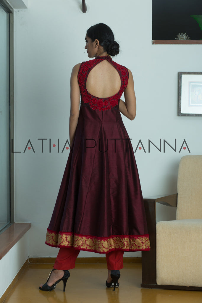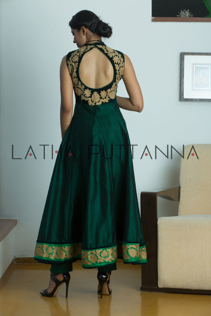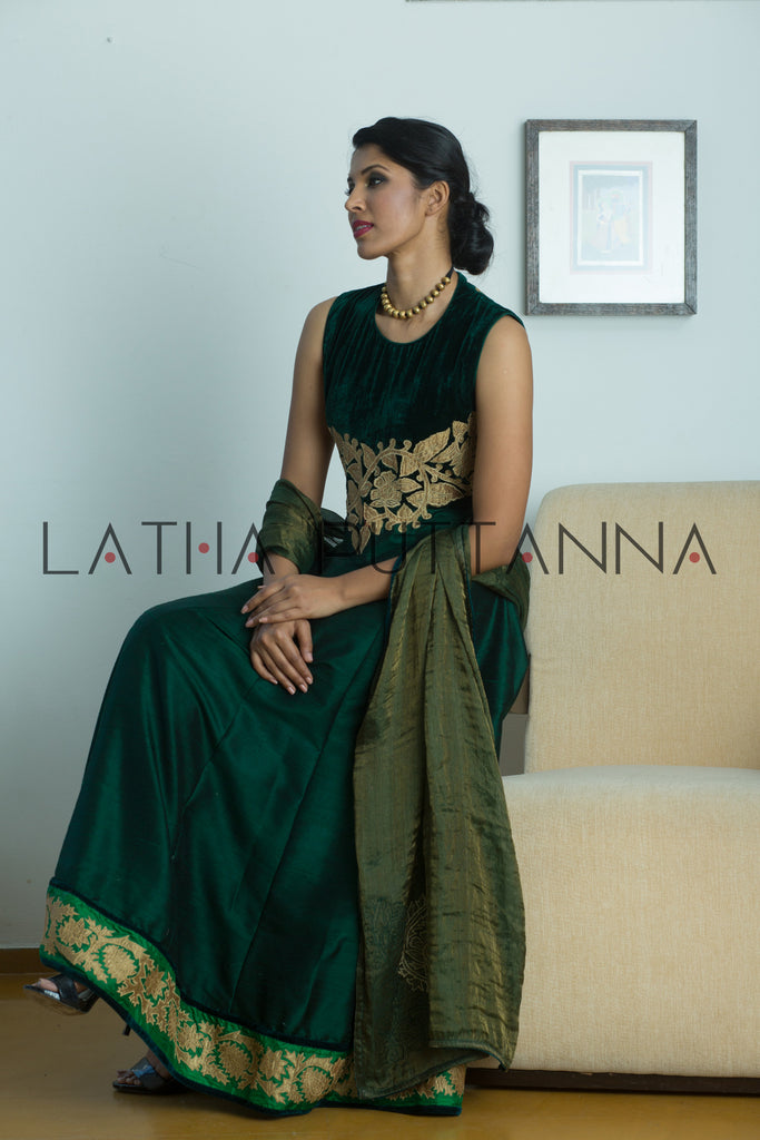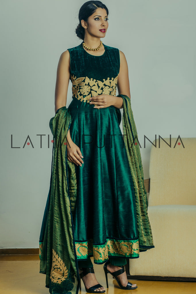 In India, nothing beats the grandeur of an event – be it a wedding or festival. And what better way to celebrate than with a befitting ensemble? Latha Puttanna has crafted this Mallige series for those who love to dress for the occasion. Made in raw silk, delicate gold and velvet appliqué have been used to complement jewel tones for a stunning look.