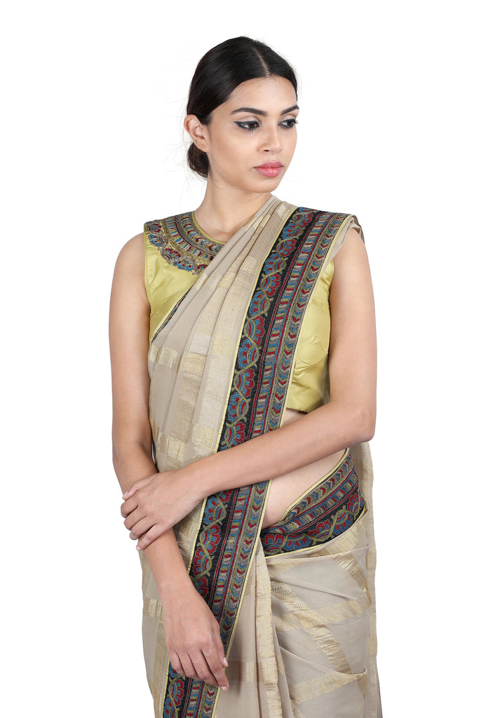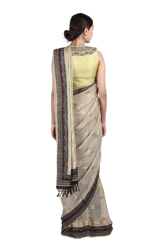 A classic brought alive, Latha Puttanna creates a masterpiece with this rendition. A beautiful grey georgette saree is made stunning with striking broad gold checks and Thread –embroidery to look like Kalamkari on the border. The saree has been paired with a silk sleevless blouse that sports similar thread embroidery on the neck.