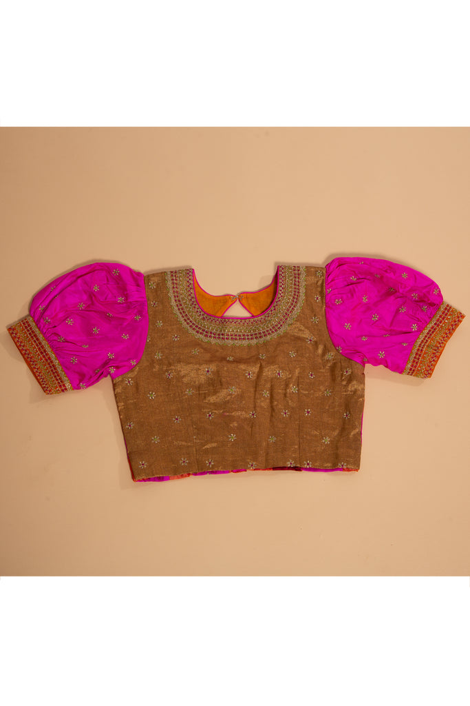 Make this festive season even more special by getting a matching wardrobe for your little one. Don her in this beautiful set comprising a silk patchwork blouse and silk langa, both embellished with intricate gold embroidery that matches your Latha Puttanna classic...!