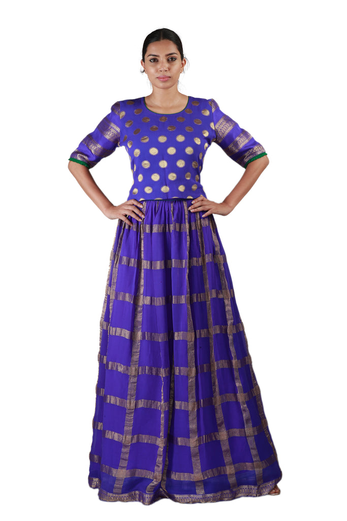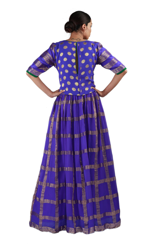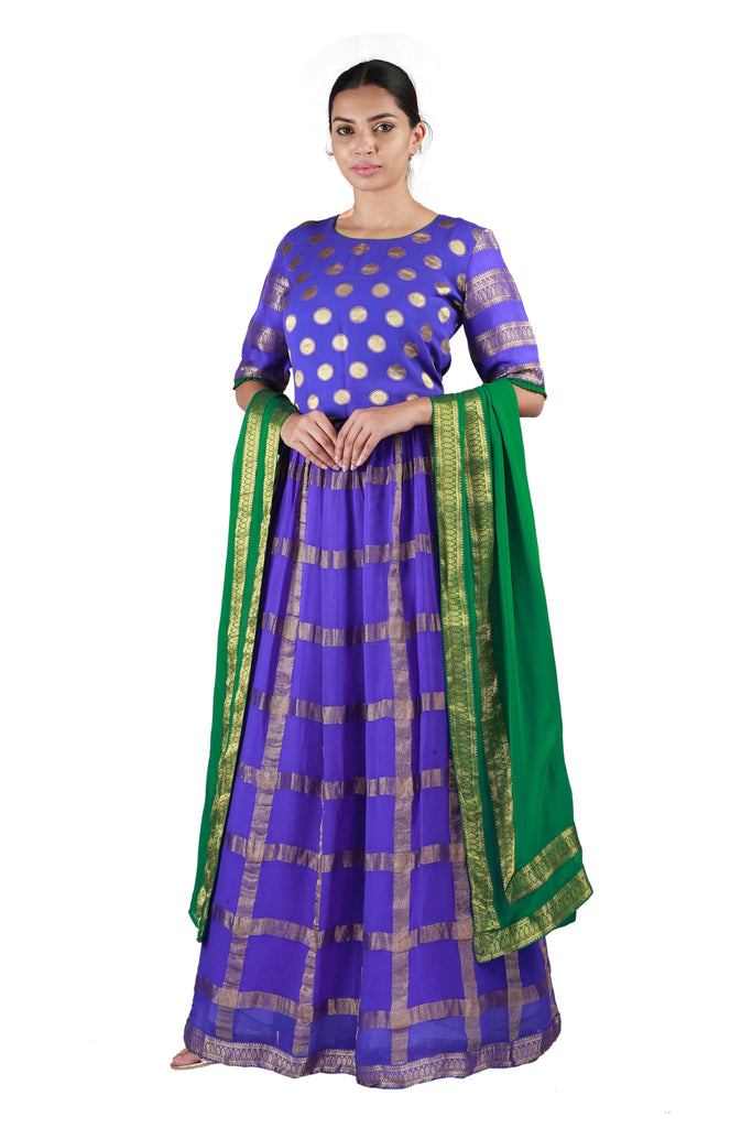 Ring in the festive season in style with this gorgeous langa set comprising a purple georgette blouse adorned with gold polkas, paired with a purple georgette skirt with broad gold checks and woven borders, and a contrasting green dupatta with woven borders.
