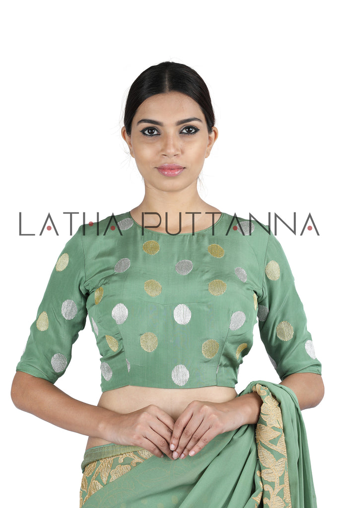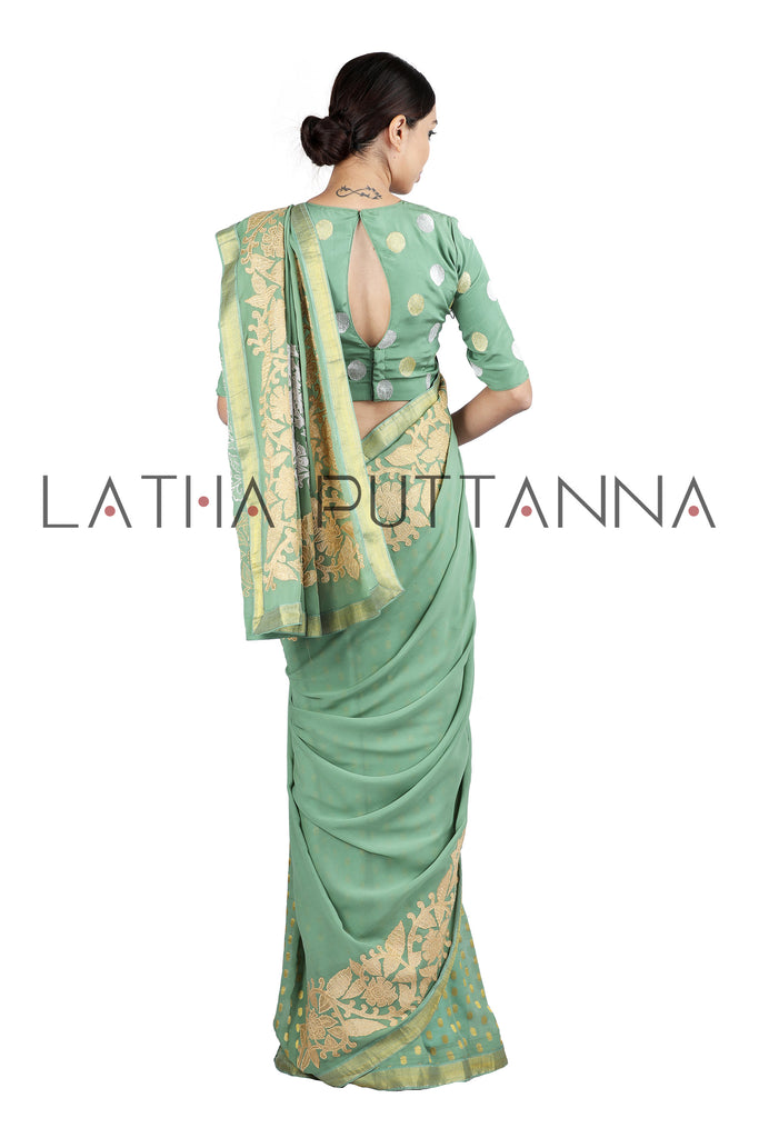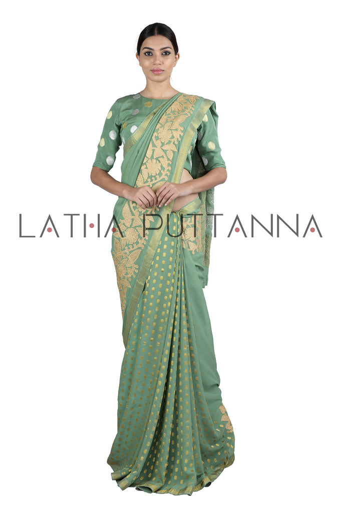 This delightful Sage green georgette saree is inspired from the royal corridors of Mysore. This saree is adorned with woven gold polkas on the pleats and gold and silver tissue appliqué enhances the border and pallu, the ensemble is sure to turn many an eyeball. A crepe silk blouse with gold and silver polkas has been used to lend a contemporary and chic look
