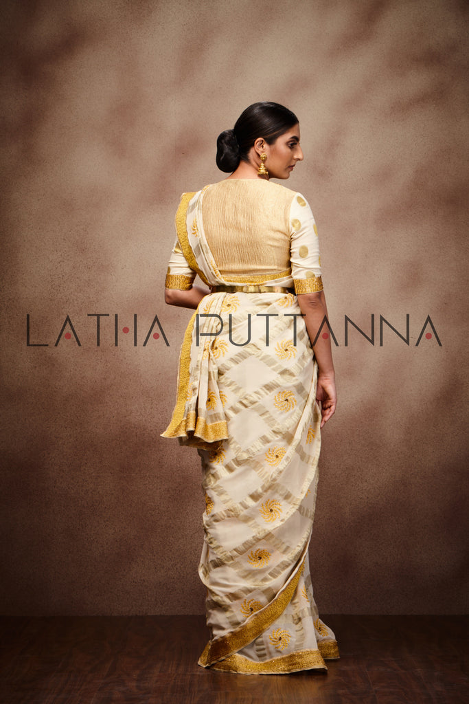 A classic brought alive, Latha Puttanna creates a masterpiece with this rendition. A beautiful off-white georgette saree is made stunning with striking broad gold checks and hand-embroidery. The subtle background elevates the gold to create an aura of festive joy and happiness. The saree has been paired with a blouse that sports gold polka and embroidery