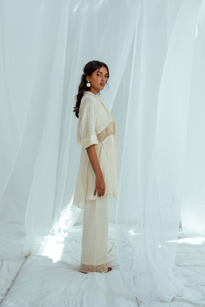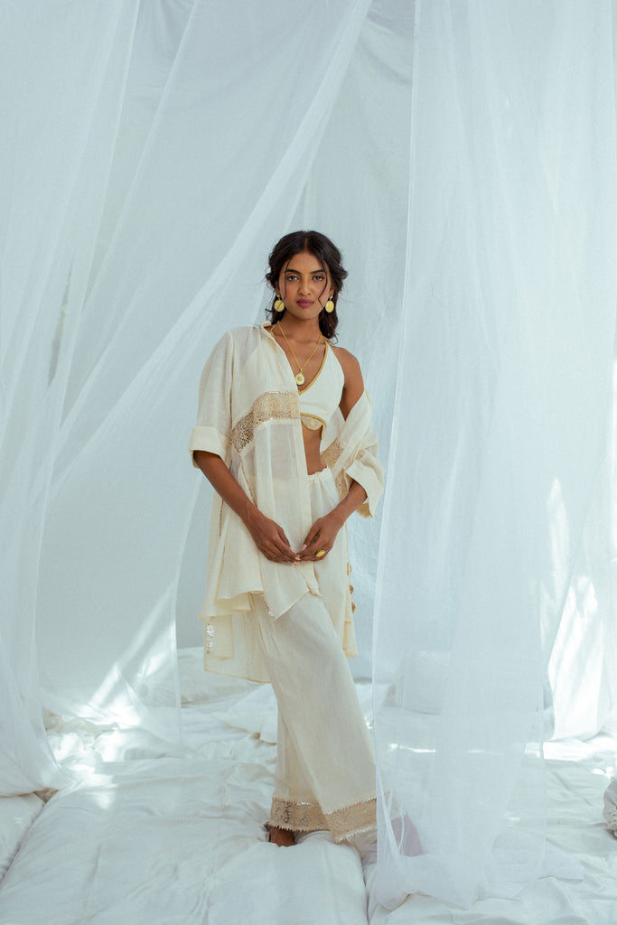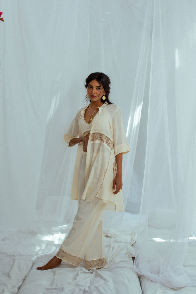 Looking for the perfect summer staple? Made with premium hand-woven cotton and detailed with machine embroidery in cream, this elegant off-white pair of pants is a must-have!