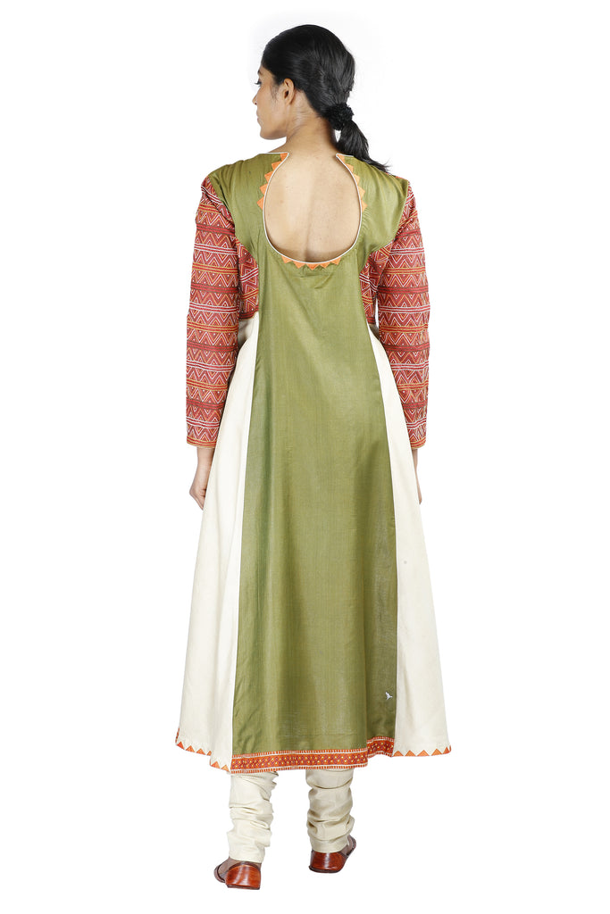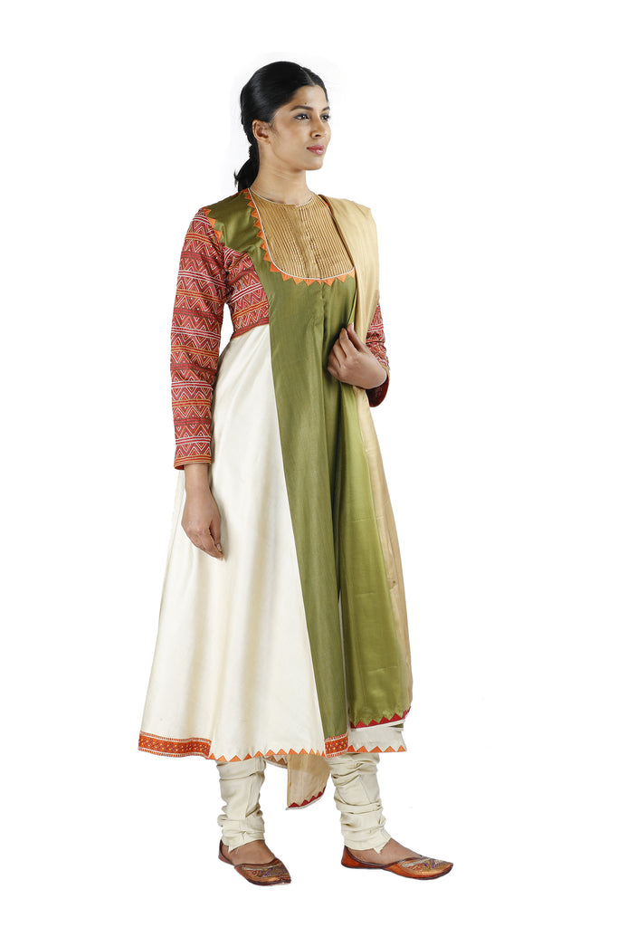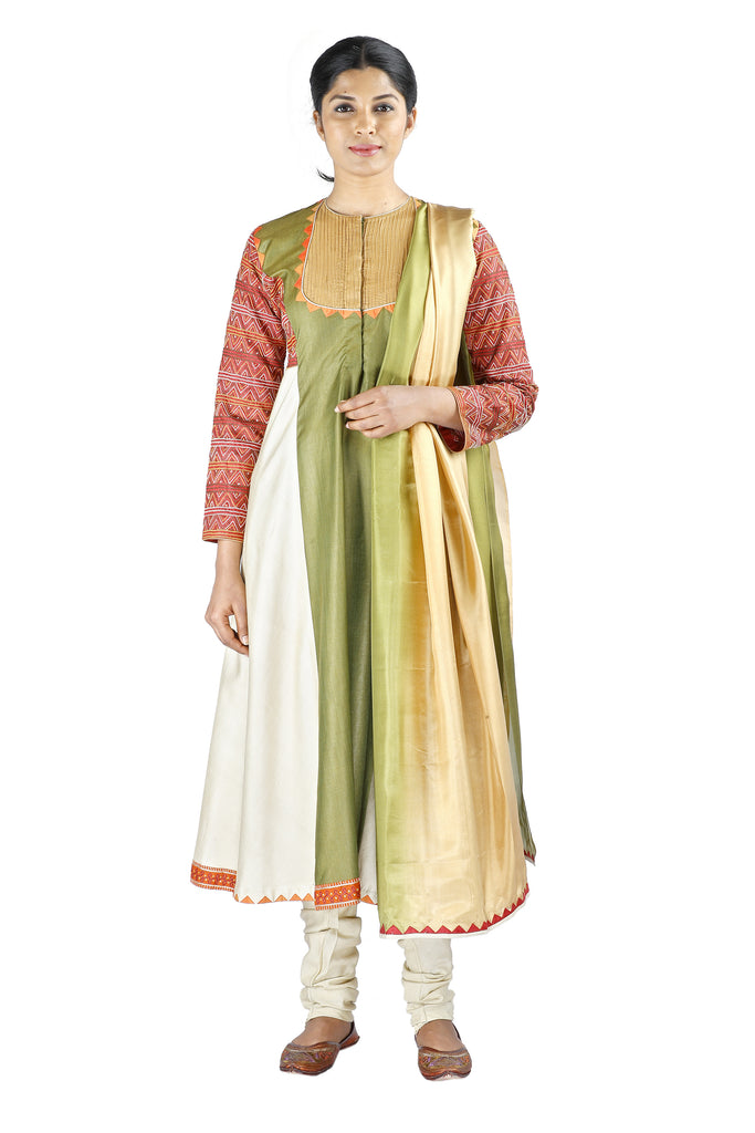 Savor your Cinderella moment with this regal ivory and green flared kurta in Tussar, crafted with elegant handmade embroidery – paired with an ivory churidaar and a beige-and-green silk dupatta.