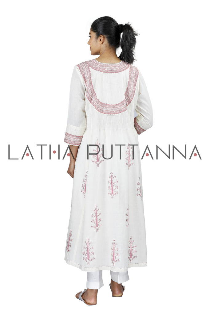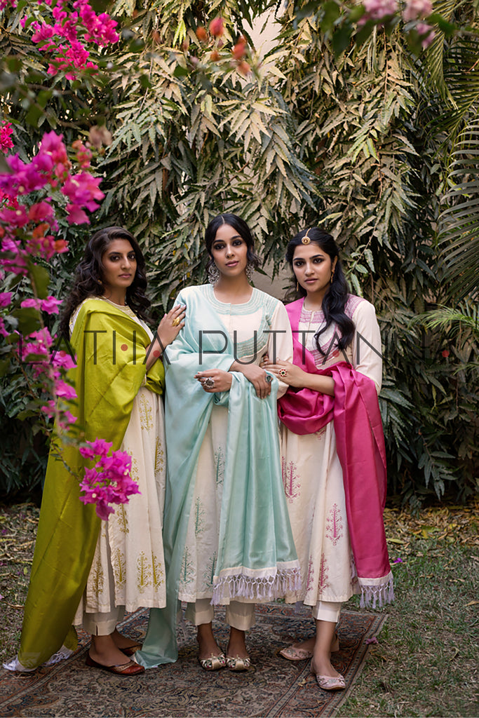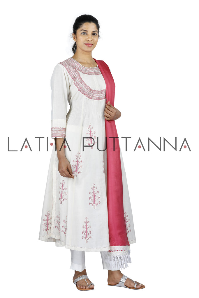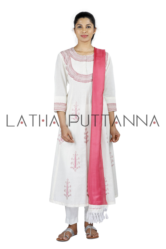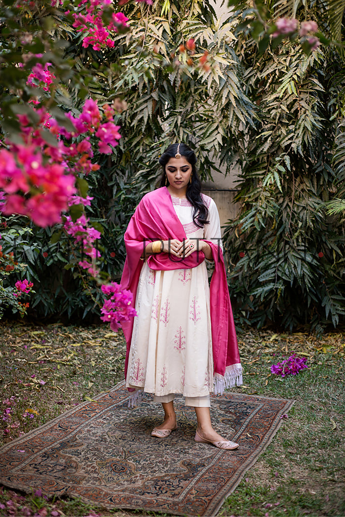 It's time to beat the heat and brighten up your summer wardrobe! Adorn this pristine white Chanderi kurta designed with a splash of pink embroidery and a stunning pink silk dupatta to make a refreshing summer statement!
