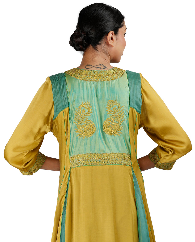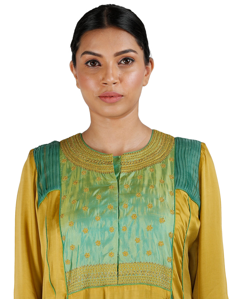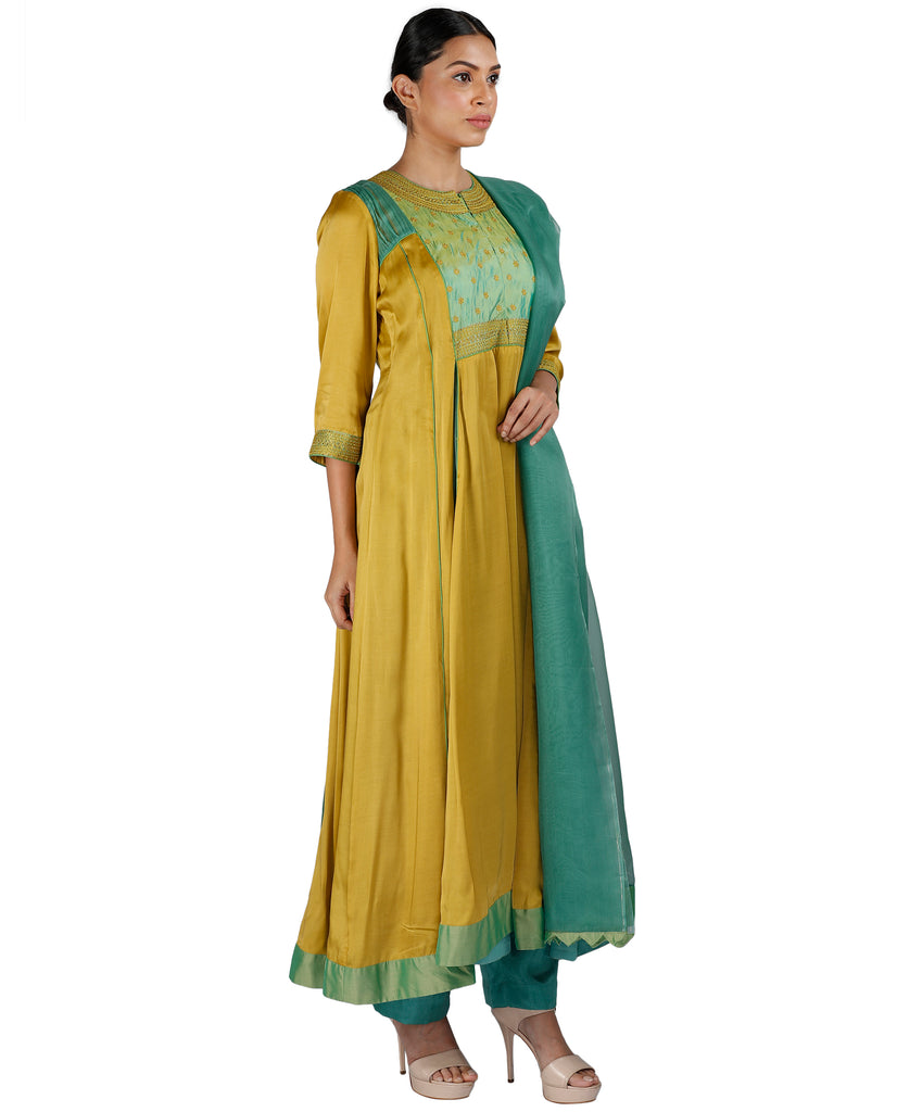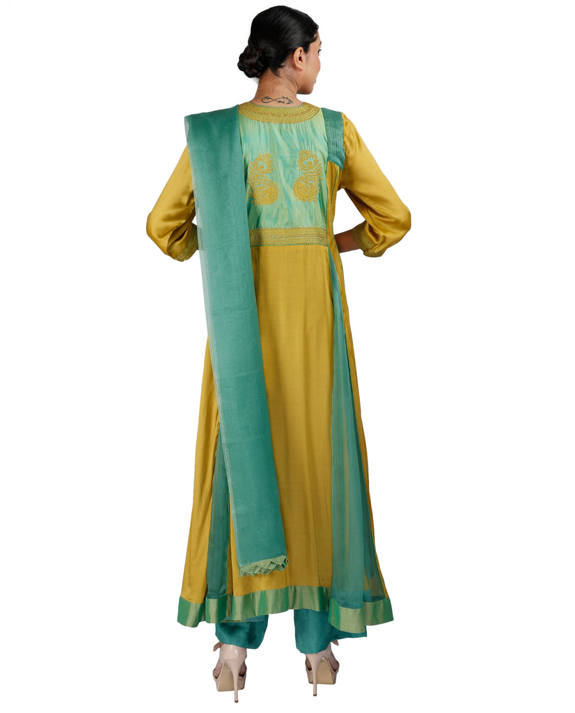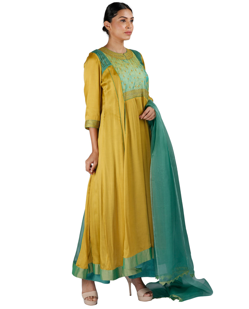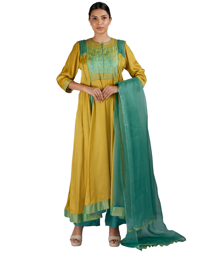 This golden yellow flared kurta crafted in silk and organza with exquisite thread embroidery in the yoke and cuff is paired with a pair of matching straight pants.  A matching green organza dupatta with border detailing completes the ensemble.