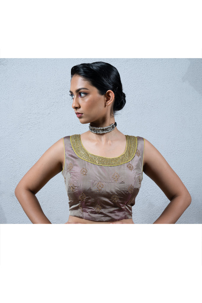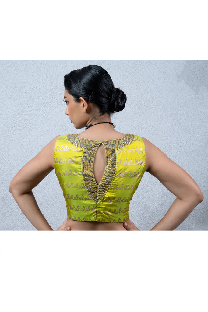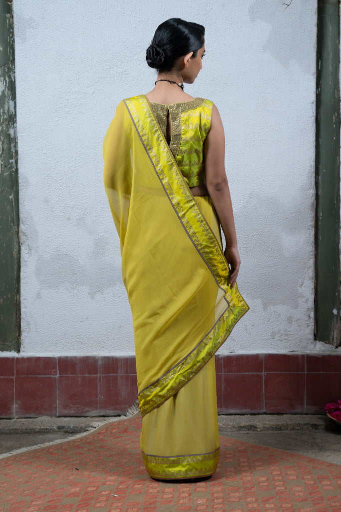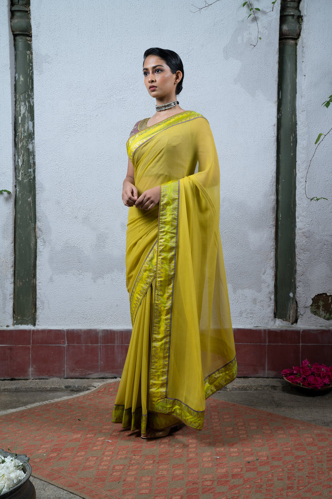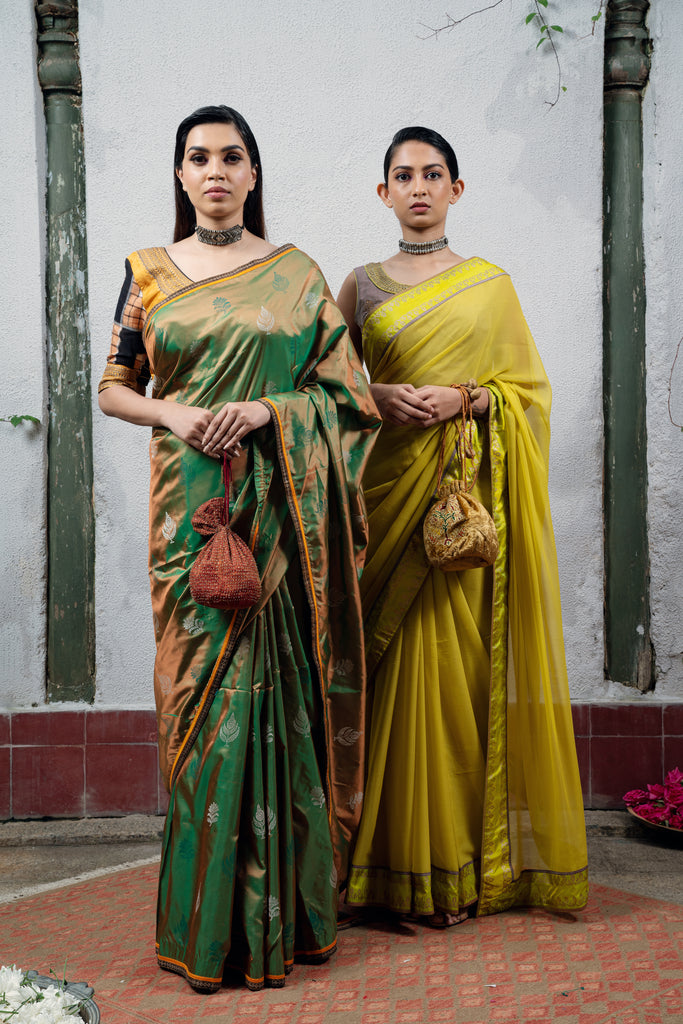 Understated elegance has its own charm – just like this plain yellow chiffon saree with a glittering yellow and gold kadi handblock print border. Paired with it is a simple silk blouse embellished with gold zari and thread embroidery. Keep it simple and breathtaking this festive season!